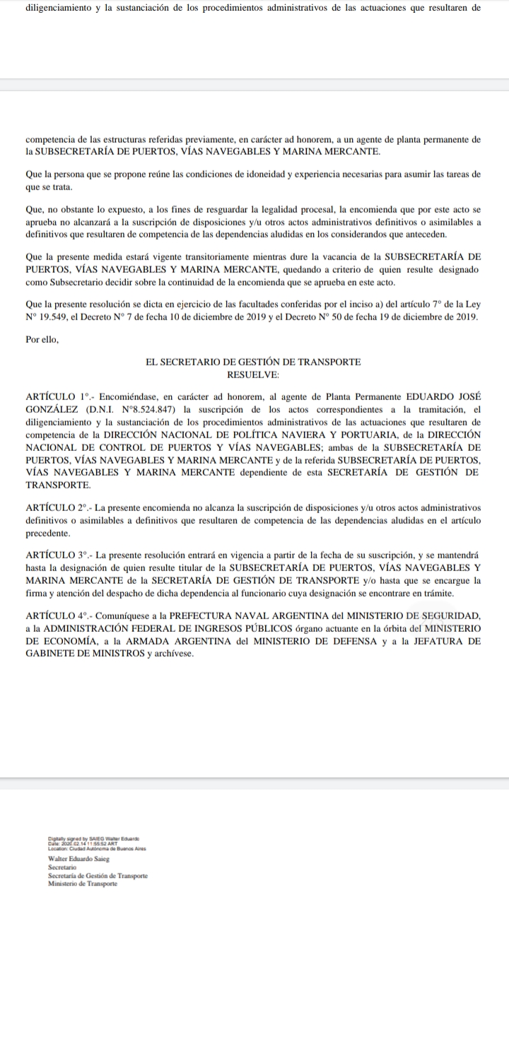 El secretario de Transporte de la Nación designó a Eduardo González, empleado de planta permanente de la Subsecretaría de Puertos la suscripción de los actos correspondientes a la tramitación, el diligenciamiento y la sustanciación de los procedimientos administrativos de las actuaciones que resultaren de competencia de la DIRECCIÓN NACIONAL DE POLÍTICA NAVIERA Y PORTUARIA, de la DIRECCIÓN NACIONAL DE CONTROL DE PUERTOS Y VÍAS NAVEGABLES; ambas de la SUBSECRETARÍA DE PUERTOS, VÍAS NAVEGABLES Y MARINA MERCANTE y de la referida SUBSECRETARÍA DE PUERTOS, VÍAS NAVEGABLES Y MARINA MERCANTE.