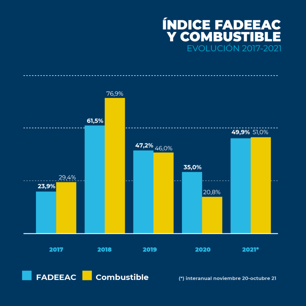 El Índice de Costos de Transporte elaborado por FADEEAC (Federación Argentina de Entidades Empresarias del Autotransporte de Cargas) exhibió en octubre de 2021 un incremento moderado de 2,1%, luego del aumento más alto del año en julio (6,32%).