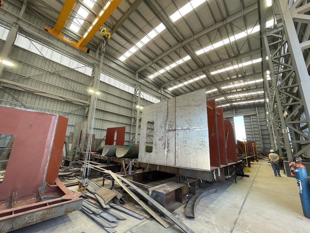 Ahora contamos con una nave que tiene 22 m por 60m, es decir que eso nos permite albergar las construcciones que ustedes estuvieron viendo. Además el astillero cuenta con dos puentes grúa de 20 Tn cada uno, que dadas sus características, hace que no tengamos limitantes constructivas. También hay una segunda grada de construcción que está terminada y estamos construyendo otras dos más. Se hizo toda la zona de transferencia nueva y se redimensionó el elevador sincrónico del astillero, es decir, que hemos aumentado aproximadamente el 60 por ciento de la capacidad productiva del astillero.