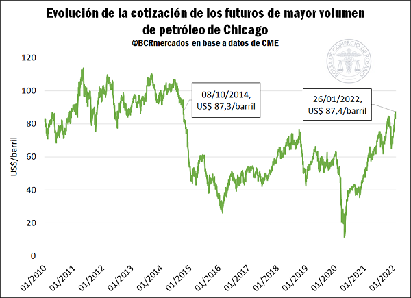 Por otra parte, el mercado del petróleo también ha ido apuntalando las cotizaciones internacionales del cereal en las últimas jornadas. Esto es así debido a que el cereal se utiliza como insumo para la producción de etanol y, consecuentemente, al encontrarse dentro del mercado de los combustibles, sus cotizaciones se ven influenciadas por el mercado petrolero. Durante esta última semana, el barril de petróleo cotizó a US$ 87,4/barril, implicando una suba del 59,7% respecto al valor que se tenía un año atrás (US$ 52,2/barril), mientras que resulta en la máxima cotización desde el año 2014. Asimismo, la soja también se vio afectada por estos movimientos alcistas en el mercado del petróleo, por la producción de biodiesel a base de aceite de soja.