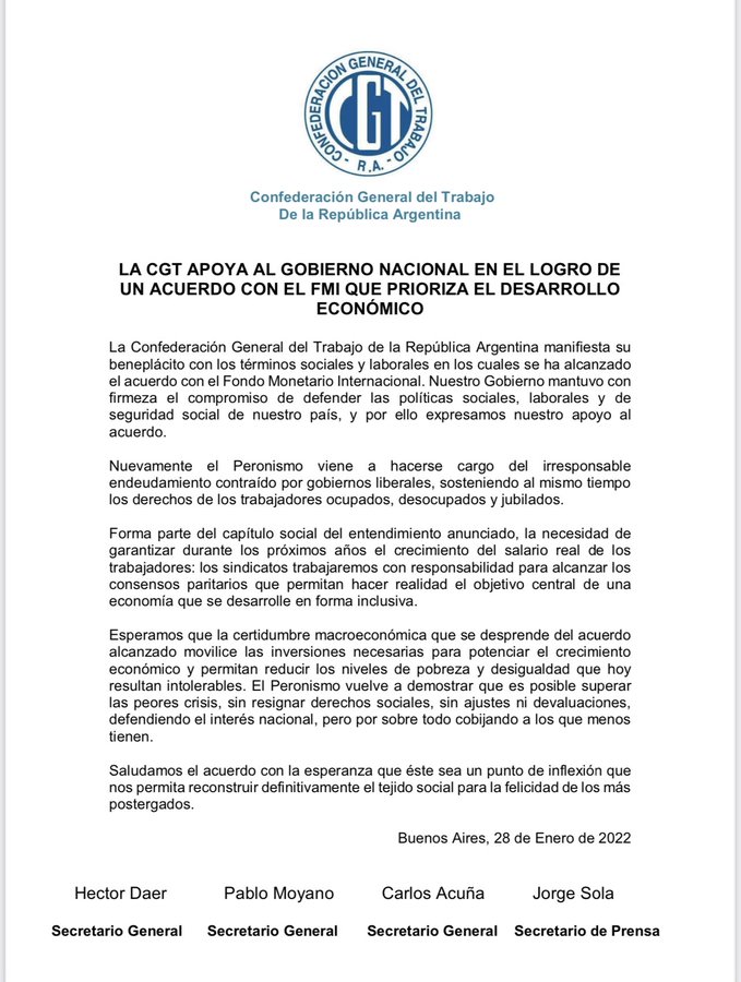 A través de un comunicado de la CGT, reclacaron que "los sindicatos trabajaremos con responsabilidad para alcanzar los consensos paritarios que permitan hacer realidad el objetivo central de una economía que se desarrolle en forma inclusiva."