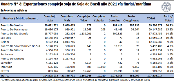 De los datos del Cuadro N° 3 se puede apreciar que gran parte del complejo soja y del complejo maíz se exporta a través de los puertos localizados en el Sureste del país (Santos, Paranaguá, Rio Grande, San Francisco Do Sul, Vitoria), representando el 71% del total de productos del complejo soja y el 52% del complejo maíz.