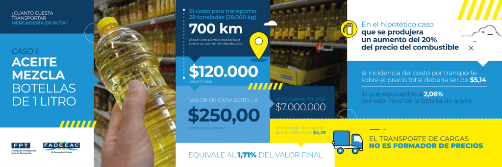 El costo para transportar 28 toneladas (28.000 kg) de aceite embotellado para consumo familiar a lo largo de 700 km (desde una planta productora hasta un centro de distribución) es de 120.000 pesos finales.