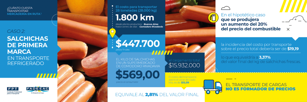 El costo para transportar 28 toneladas (28.000 kg) de salchichas de primera marca a lo largo de 1.800 km (desde una planta productora en Buenos Aires hasta un centro de distribución en Comodoro Rivadavia) es de 447.700 pesos finales.