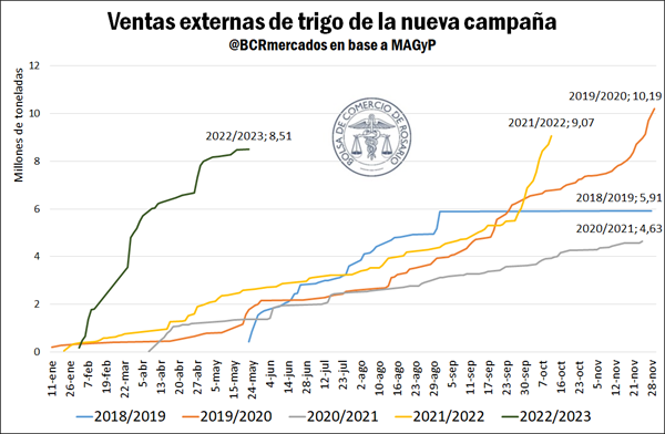 La comercialización de trigo 2022/23 sigue sumando toneladas. Con más de 0,5 Mt anotadas en el mes, el total de ventas externas de trigo de la campaña venidera ya supera las 8,5 Mt, restando menos de medio millón de toneladas por declarar en el corto plazo, en vistas del volumen de equilibrio establecido por el MAGyP.