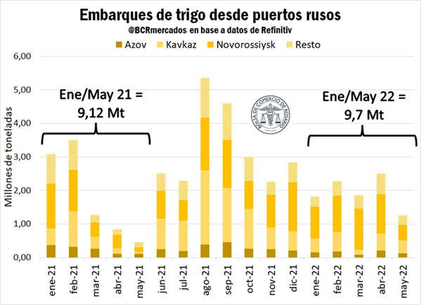 Inesperadamente, el panorama exportador ruso viene ubicándose por encima de los volúmenes exportados el año pasado con 9,7 Mt en los primeros cinco meses del año y encontrándose próximo al inicio de la nueva campaña comercial. En este sentido, las sanciones de un amplio espectro de países hacia Rusia no alcanzan a sus embarques de trigo, que tienen a Turquía y Egipto como principales destinos
