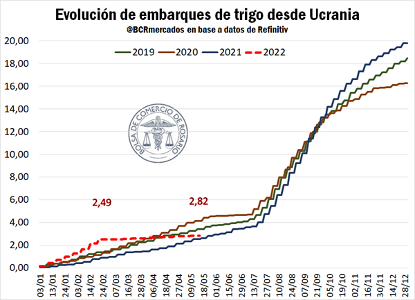 Mientras tanto, los embarques de trigo desde puertos ucranianos acumulan 2,82 Mt en lo que va del año, con un estancamiento casi total de despachos del cereal desde el inicio de la guerra con 0,33 Mt respectivamente.