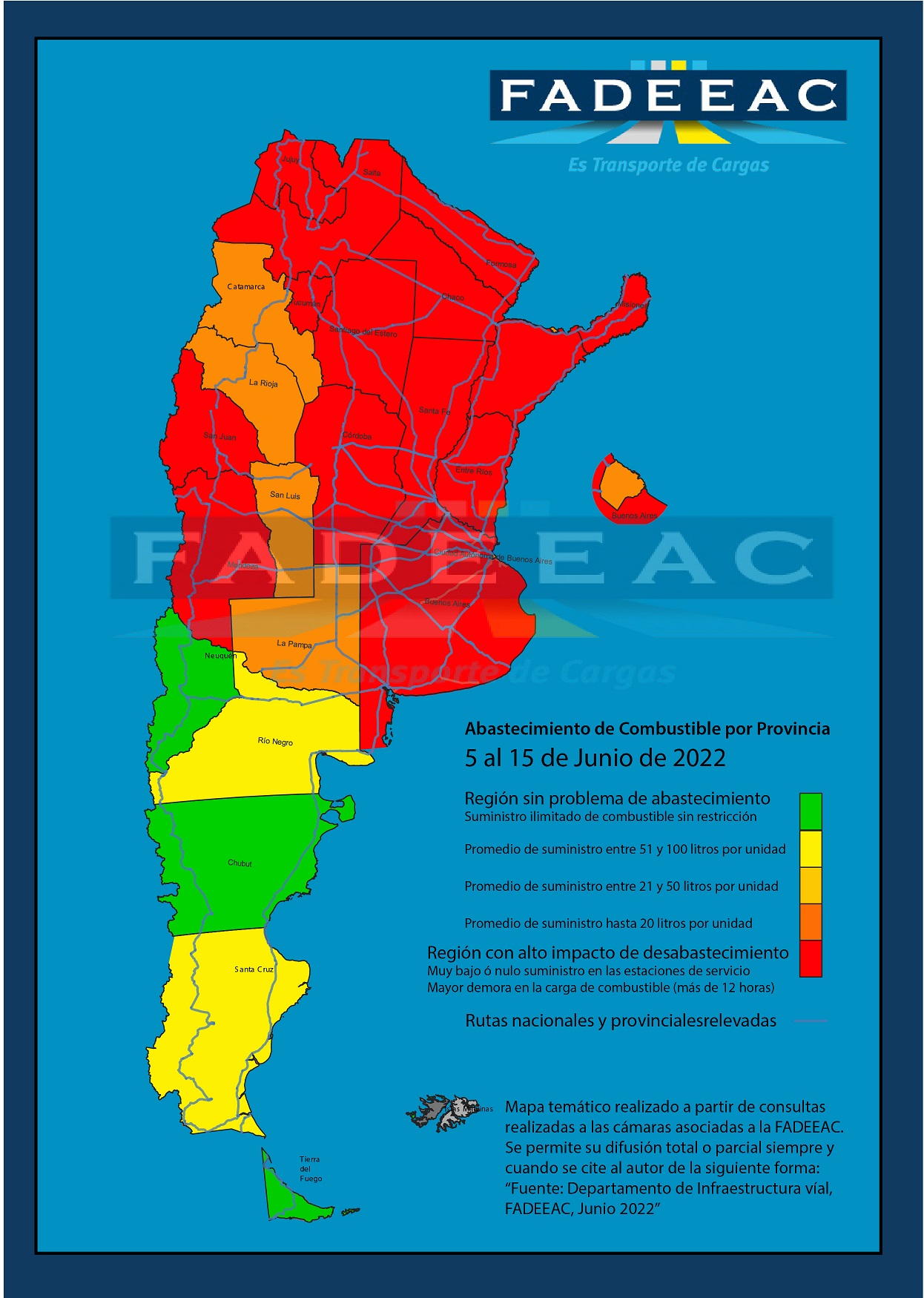Las dificultades del transporte de cargas para repostar combustible en la Argentina siguen incrementándose. El “Mapa de abastecimiento de gasoil”, creado por técnicos de la Federación Argentina de Entidades Empresarias del Autotransporte de Cargas (FADEEAC), muestra que entre el 5 y el 15 de junio, 21 provincias presentaban problemas para acceder al mismo.