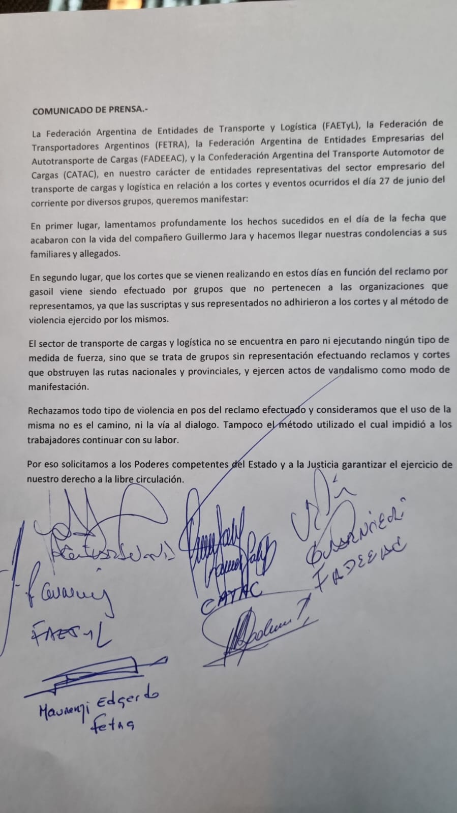 Las entidades agregan que la situación aún es más complicada pues por más que en algunas zonas se haya liberado el tránsito, no se están cargado camiones en origen por el temor de los transportistas a no poder descargar luego en los puertos. Asimismo, siendo que no existe un paro de transporte sino una medida llevada a cabo por distintos grupos de transportistas sin ninguna representación institucional, solicitan a las autoridades competentes que brinden las garantías necesarias para los transportistas con el fin de evitar consecuencias fatales como lo ocurrido recientemente en la localidad de Daireaux.