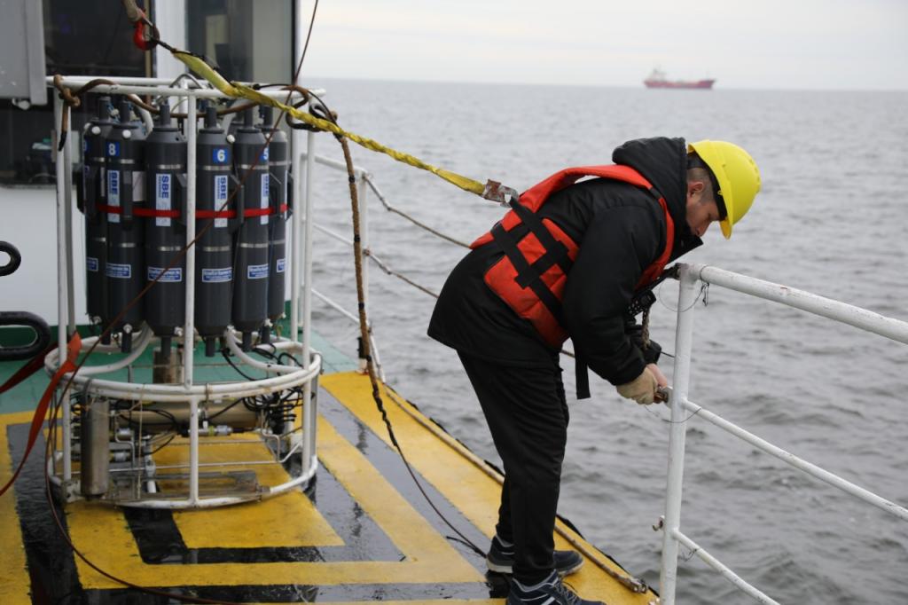 También se llevó a cabo una estación oceanográfica en punto fijo en proximidades del Pontón Recalada, como inicio de una posible estación permanente de muestreo ambiental. Para esto, se empleó una roseta provista de CTD y botellas oceanográficas para obtención de muestreas de agua en cercanías del fondo, columna de agua y la superficie.