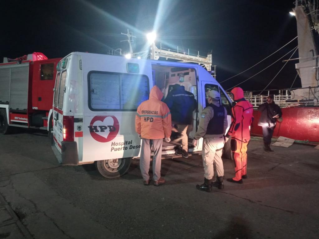 Personal especializado de la Prefectura Naval Argentina rescató a un hombre que había caído al agua desde un buque en el puerto de Puerto Deseado, Santa Cruz.