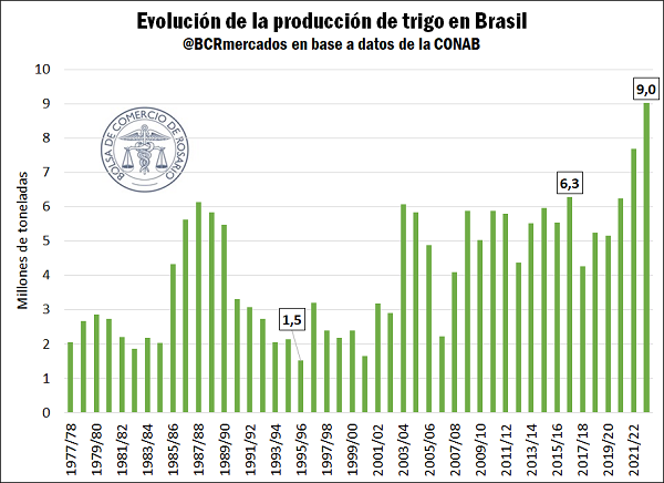 La evolución de Brasil en términos de producción de bienes agrícolas muestra año a año las enormes capacidades de nuestro país vecino para superar sus propios resultados, situándose como uno de los principales jugadores dentro del abastecimiento mundial de alimentos. No obstante, en el caso del trigo, la demanda supera a la oferta brasileña, razón por la cual nuestro país vecino importa cereal, principalmente argentino. No conforme con ello, para el ciclo 2022/23 se espera que la producción de Brasil tenga un fuerte incremento de la mano de una mayor superficie destinada al cultivo de invierno y a los rendimientos crecientes.
