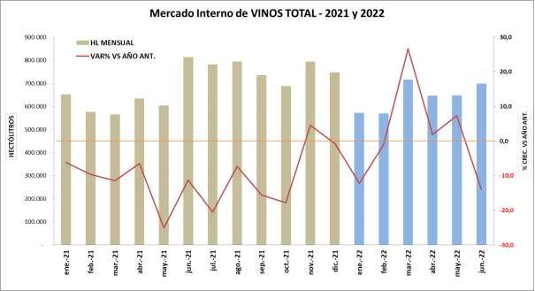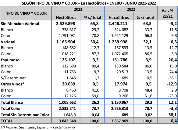 Los repuntes en blancos sin mención varietal, varietales de todos los colores y espumosos, durante el primer semestre 2022, muestran un consumo sostenido en el mercado interno de vinos.