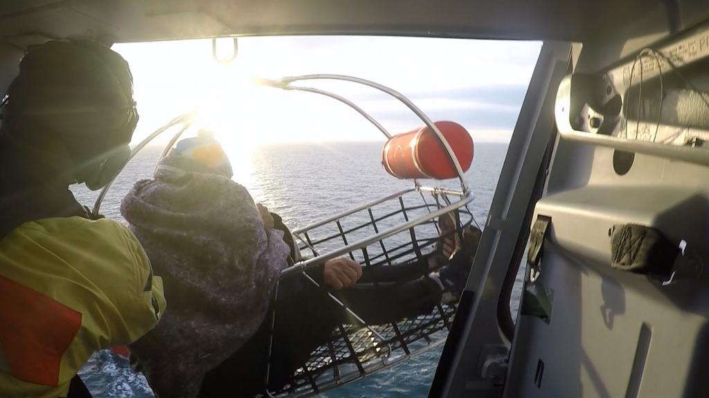 Una vez sobre el buque, se descendió una canasta sanitaria e izó al tripulante, quien recibió las primeras asistencias a bordo del helicóptero, mientras en tierra se coordinaba el arribo de una ambulancia al aeropuerto de la ciudad de Trelew, la cual luego trasladó al tripulante para una mejor atención.