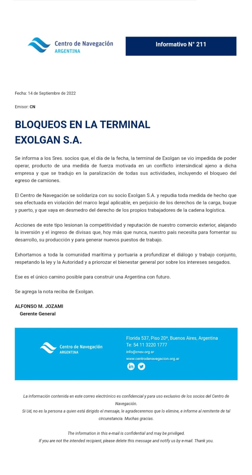 Es por ello que el Centro de Navegación emitió un comunicado en el cual se solidarizó con su socio Exolgan S.A. , en donde "repudia toda medida de hecho que sea efectuada en violación del marco legal aplicable, en perjuicio de los derechos de la carga, buque y puerto, y que vaya en desmedro del derecho de los propios trabajadores de la cadena logística. Acciones de este tipo lesionan la competitividad y reputación de nuestro comercio exterior, alejando la inversión y el ingreso de divisas que, hoy más que nunca, nuestro país necesita para fomentar su desarrollo, su producción y para generar nuevos puestos de trabajo."