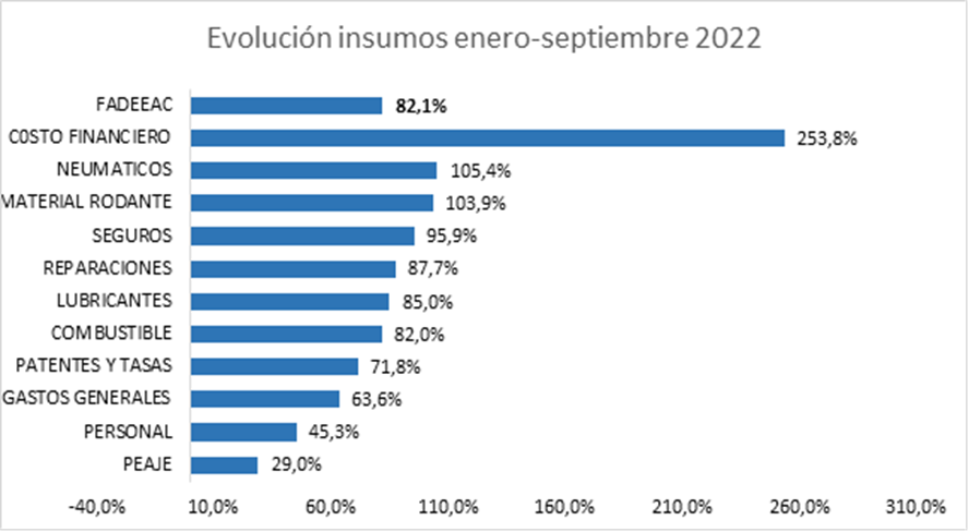 Con este registro, la variación acumulada alcanza un récord de aumento de costos de transporte de 82,1% al tercer trimestre de 2022 (enero-septiembre de 2022), mientras que la variación acumulada alcanza el 96% en los últimos doce meses, en un contexto de continua aceleración de la inflación minorista y mayorista en la economía.