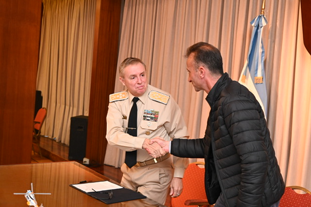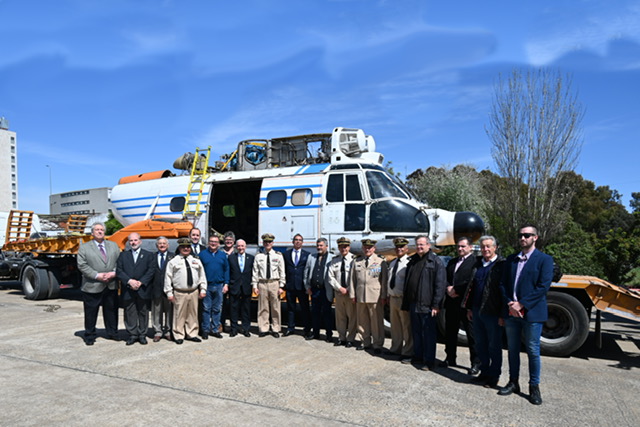 Durante el acto, el jefe de la Prefectura y el intendente municipal de la mencionada localidad cordobesa, José Ibarra, formalizaron la firma de un acta para la entrega y recepción del fuselaje del rezago del helicóptero ex PA-13, aeronave que formó parte de la flota de la Prefectura que participó en el teatro de operaciones de la Guerra.