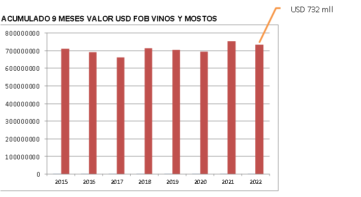 El total de las exportaciones argentinas de vinos y mostos fue de 732 Millones de dólares en el acumulado 2022, 3,8% menor que el 2021.