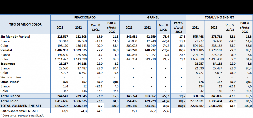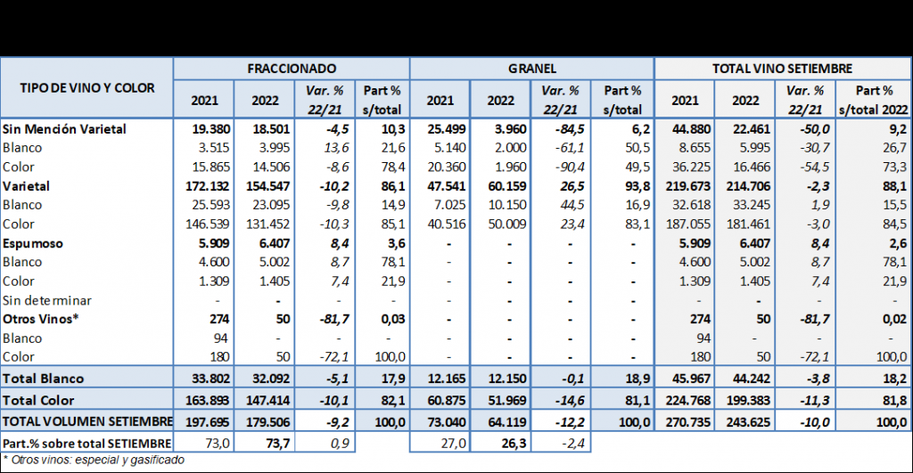 Las exportaciones en volumen de vinos argentinos tuvieron una reducción del 10% durante el mes de septiembre 2022 respecto del mismo mes 2021. Las bajas más sensibles se registraron en vinos sin mención varietal sobre todo graneles.