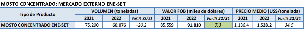 El mosto concentrado también está mostrando en los 9 meses del 2022 una caída de volumen y aumento de valor FOB por precios superiores en orden con lo que ocurre a nivel mundial ( s/OeMv).