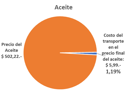 Tomando en cuenta una botella de aceite cuyo precio al consumidor es de $502, el cargamento total tendrá un valor de 14,1 millones de pesos. Sobre el valor de cada botella ($502), el peso del costo de transporte es de $5,99, lo que equivale al 1,19% del valor final.