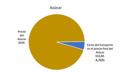 Tomando en cuenta que el kilo de azúcar de primera marca en un supermercado es de $229 para el consumidor final, el cargamento total tendrá un valor de 6.412.000 pesos. Sobre el valor de cada kilo ($229), el peso del costo de transporte es de $10,89.-, lo que equivale al 4,76% del valor final.