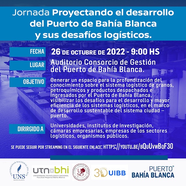 El miércoles 26 de octubre se realizará a las 9 hs en el auditorio del consorcio de gestion una jornada de proyección del desarrollo portuario de Bahía Blanca. La misma se podrá seguir a través de streaming en plataforma virtual.
