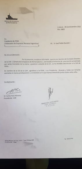 A través de una carta firmada por el presidente de la entidad, Carlos Ruis Moreno, se informa que tras una reunión de Comisión Directiva de la Cámara de Armadores de Remolcadores, convocada a instancias de una moción presentada por varias asociadas y posterior votación de la Comisón Directiva, se ha tomado esa decisión.
