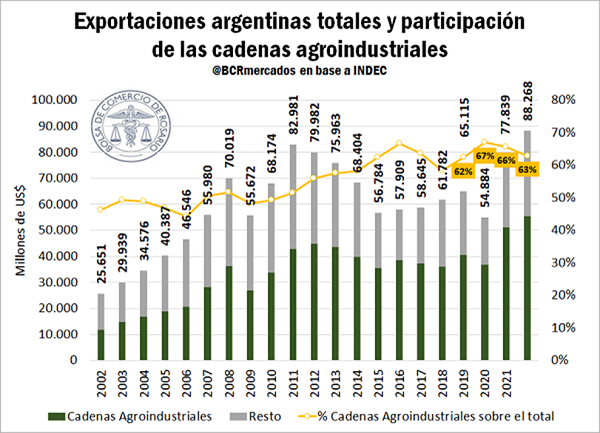 Argentina alcanzó en 2022 las mayores exportaciones de su historia, con más de 88.000 millones de dólares. La participación del agro asciende al 63%, registrando máximos históricos en despachos de los complejos Soja, Maíz, Trigo, Carnes, Girasol y Cebada.