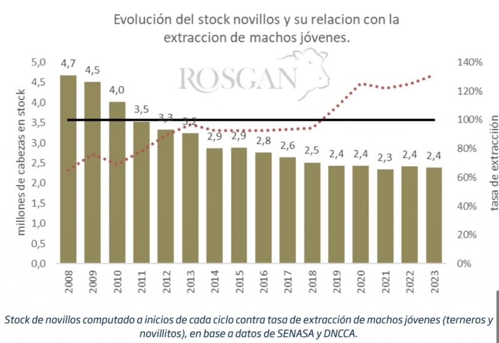 Si observando una serie desde el año 2008 a la actualidad, la tasa de extracción de machos jóvenes -esto es la cantidad animales faenados durante un período anual medido sobre el stock inicial de novillitos para ese ciclo- pasó del 65% al 125% en 2022 y 131% en 2023. Esto implica que, desde 2019 con tasas de extracción superiores al 100%, estuvimos faenando más novillitos que los registrados a inicios del año, lo que supone que estuvimos terminando y faenando terneros destetados durante ese mismo ciclo.