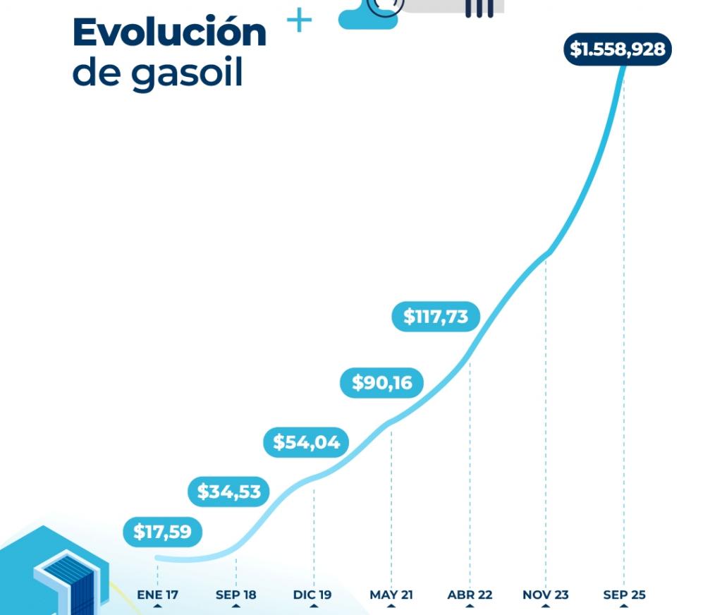 El combustible, componente de mayor incidencia en la actividad, exhibió un alza de 3,82% en septiembre, acumulando un incremento de 17% en los últimos cuatro meses. Pese a esta dinámica, continúa vigente el diferimiento en la aplicación de los impuestos específicos a los combustibles, prorrogado por el Decreto 699/25 para todo octubre.