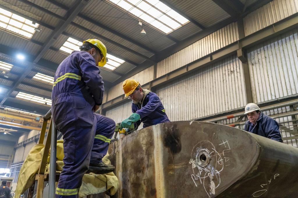 El área de calderería tuvo una intervención significativa. Además de la pala de timón, renovó una sección de 2,5 metros de la pluma de la grúa de carga N°1 en acero AH36, incluyendo su brida de unión. Ejecutaron también la fabricación y montaje de tres tapones y portatapones , efectuaron el desmontaje y reinstalación de guardacabos y, la reparación completa de las cuatro palas de la hélice propulsora mediante aporte de soldadura y amolado para recuperar su geometría original. Además, realizaron trabajos de renovación de acero en casco y estructura asociada.