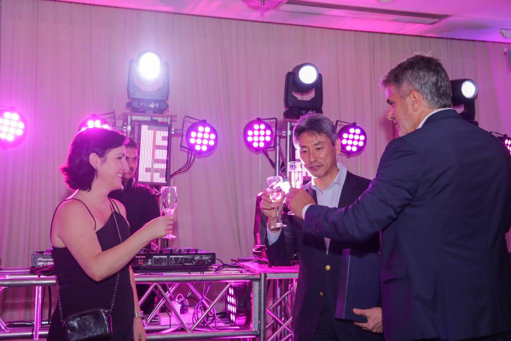 Acompañaron el brindis dos figuras clave de la estructura regional que operan desde las oficinas de Sao Paulo, Brasil, de la naviera: Tomoya Ishigaki, vicepresidente de Ocean Network Express y responsable de Corporate & Innovation para Latin America Regional Head Quarter, y Luciana Sasso, directora de Marketing & Commercial para la misma región. Ambos subieron al escenario como parte de la presentación oficial realizada por Maggi.