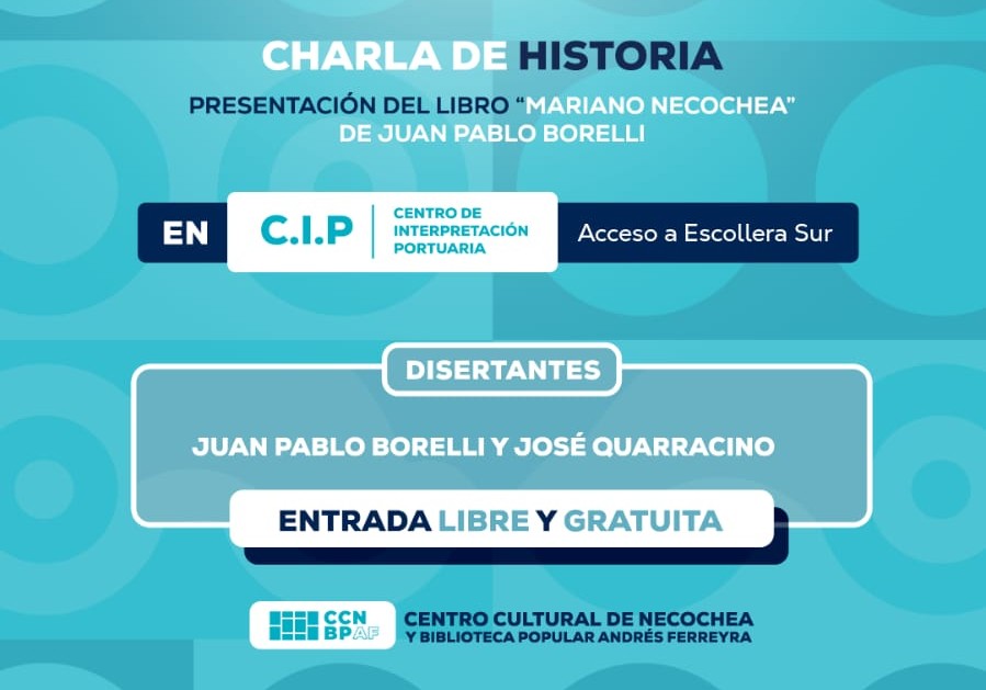 En el marco de la propuesta itinerante Biblioteca de Bolsillo Sobre Ruedas, el Centro de Interpretación Portuaria (CIP) en conjunto con el Centro Cultural Necochea Biblioteca Popular "Andrés Ferreyra" será escenario de la charla presentación de "Mariano Necochea" del autor local Juan Pablo Borelli, con la participación y comentarios de José Quarracino.