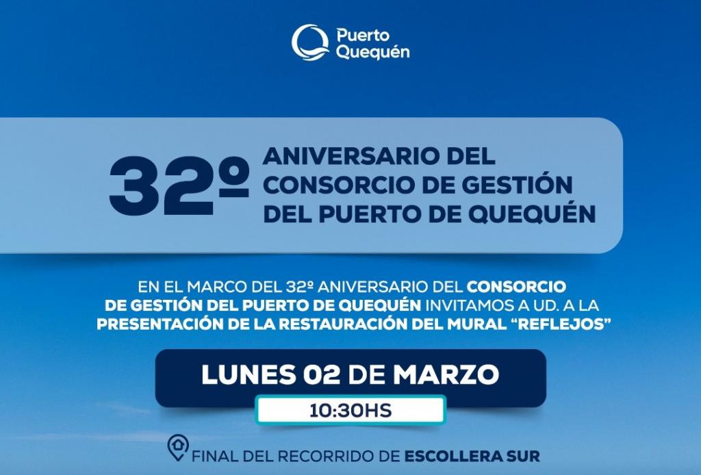 En el marco de un nuevo aniversario del Consorcio de Gestión del Puerto de Quequén, este lunes 2 de marzo a las 10:30 horas se llevará a cabo la presentación de la restauración del mural “Reflejos”, emplazado al final del recorrido de la Escollera Sur de Puerto Quequén.