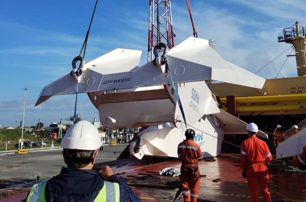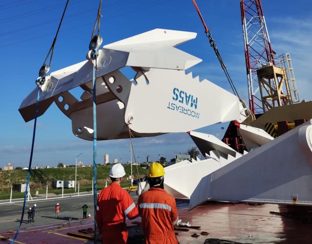 Loginter estuvo a cargo de la descarga de 12 anclas de 43 toneladas cada una y un total de 900 toneladas de cadenas, coordinando los movimientos desde la bodega del buque hasta su carga sobre camiones de traslado en el Puerto de Quequén.